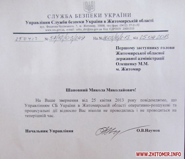 «Уткой» оказалось и сообщение о том, что «сейчас в Управлении Министерства внутренних дел и прокуратуре Житомирской области рассматривается вопрос о возбуждении в отношении Николая Олещенко уголовного дела по ст. 369 Уголовного кодекса Украины (злоупотребление властью или служебным положением), что может грозить сроком до 8 лет лишения свободы».