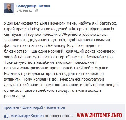 «У дні Великодня та Дня Перемоги мене, мабуть як і багатьох, вкрай вразив і обурив викладений в інтернеті відеоролик із святкування групою молодиків 70-річного ювілею дивізії «Галичина». Додумались до того, щоб викласти свічками фашистську свастику в Бабиному Яру. Таке відверте блюзнірство – ще один наочний, кричущий доказ хронічних хвороб нашого суспільства, стертої пам’яті і безпам’ятства. Таке дикунство є нахабним викликом повсюдним і повсякчасним розмовам про європейський вибір України. Розумію, що моралізаторством подібні витівки вже не зупинити. Тому направив до Генеральної прокуратури депутатський запит з вимогою встановити осіб, причетних до організації цього ганебного заходу, та вжити заходів реагування», - пише Володимир Литвин.