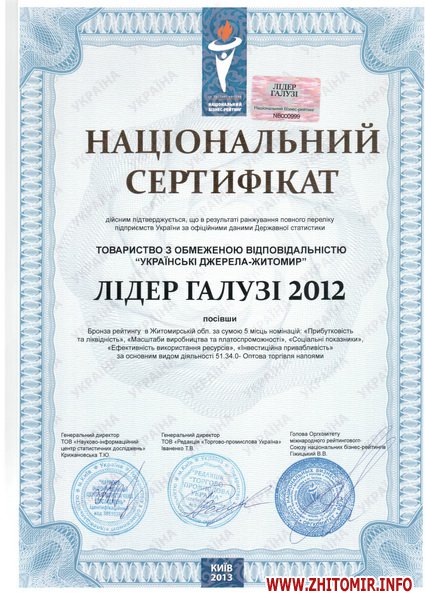 В результаті аналізу показників діяльності підприємств України з аналогічними видами діяльності, компанія «Українські джерела - Житомир» отримала персональний «Національний сертифікат» та медаль «Лідер галузі».