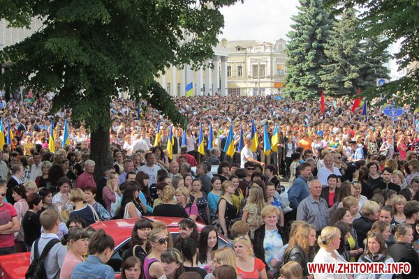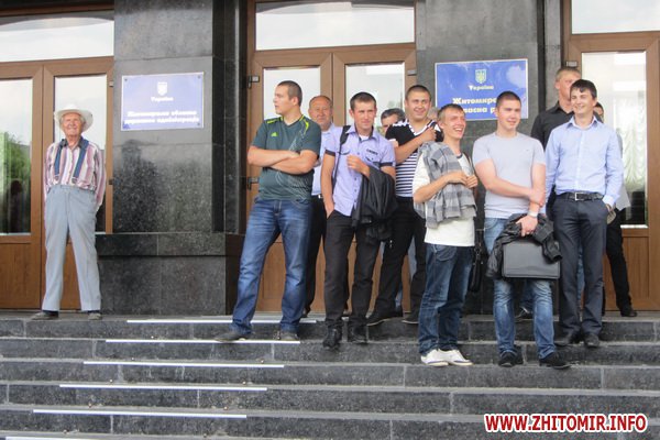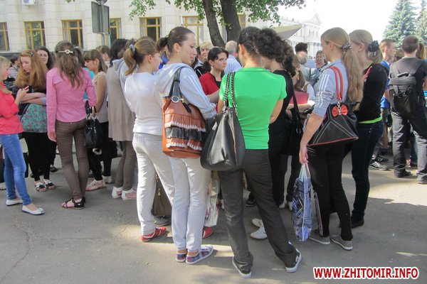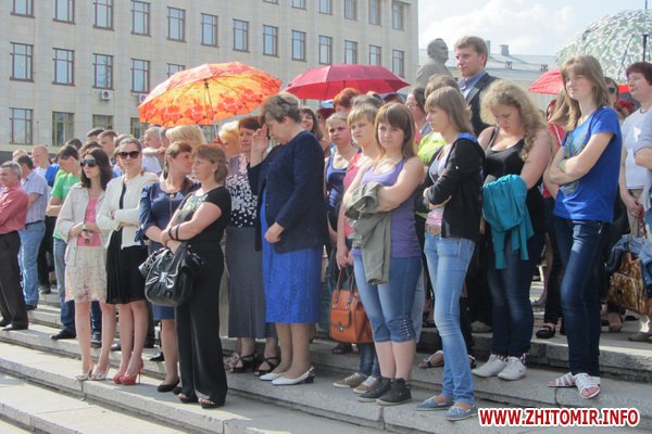 К зданию областной госадминистрации на площади Королева преподаватели техникумов, институтов и университетов Житомира привели своих учеников. Шли организованно, группами, некоторые несли государственные флаги.