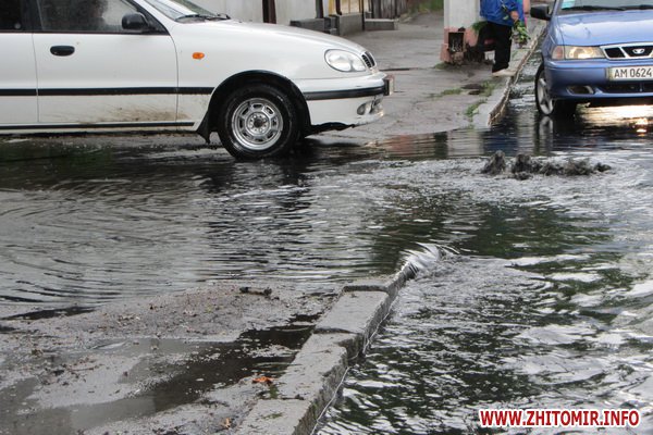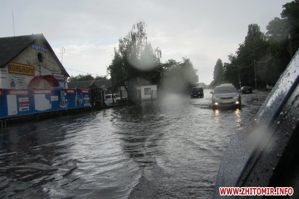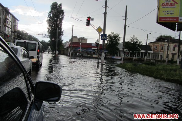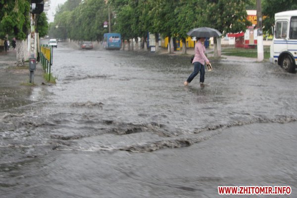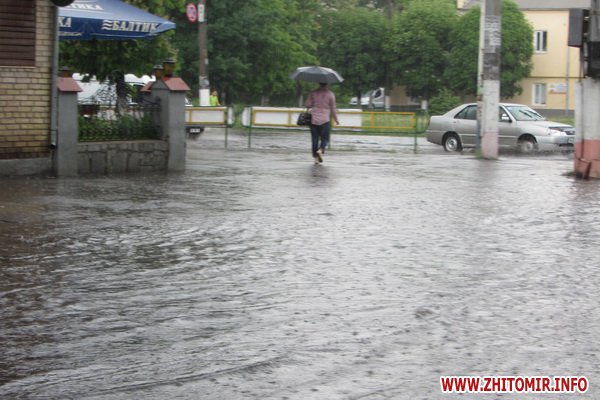 16 мая ливень, который длился около получаса, залил перекрестки и тротуары в центре Житомира.
