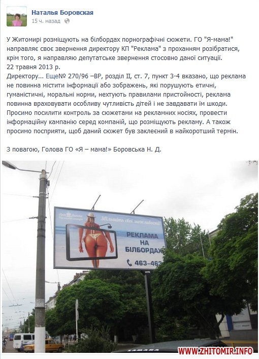 «В Житомире размещают на биллбордах порнографические сюжеты. ОО «Я-мама!» направляет свое обращение директору КП «Реклама» с просьбой разобраться, кроме того, я направляю депутатское обращение относительно данной ситуации», - пишет Наталья Боровская.