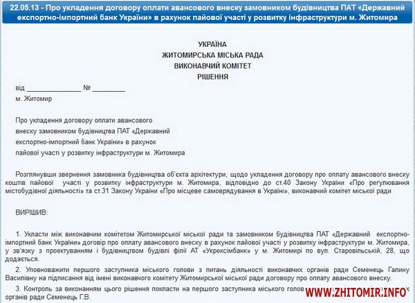 Также было бы небезынтересно ознакомиться с дополнением к проекту решения горисполкома «О заключении договора оплаты авансового взноса заказчиком строительства ОАО «Государственный экспортно-импортный банк Украины» в счет долевого участия в развитии инфраструктуры Житомира». Напомним, что Укрэксимбанку отдали земельный участок на ул.Старовильской и банк обещал выделить почти 2 млн.грн. на покупку квартир жильцам снесенного дома №28. Но, увы: договор находится в дополнении к проекту решения, дополнения на сайте нет.
