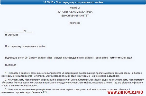 Или проект решения горисполкома «О передаче коммунального имущества», которым на баланс коммунального предприятия «Реклама» Житомирского городского передают имущество КП «Информационно-издательский центр Житомирского городского совета». Но без приложения со списком имущества ознакомиться нельзя, а соответственно, нельзя понять – все скопом передается и издательский центр на грани ликвидации или же передают пару компьютеров и несколько столов?