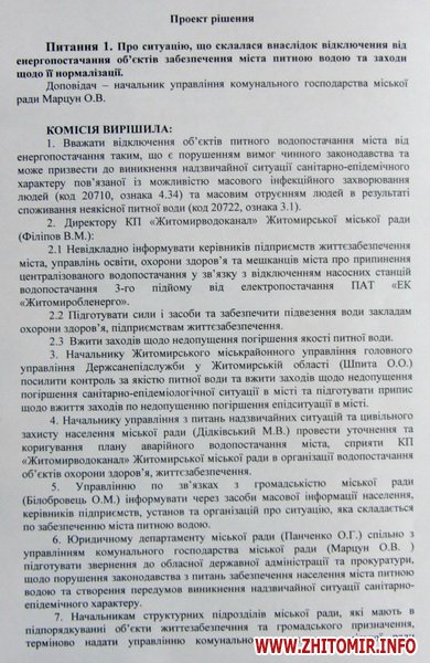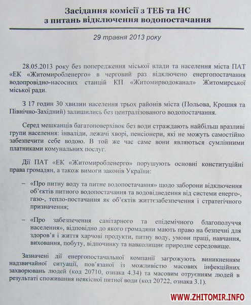«28 мая без предупреждения городской власти и жителей города ПАО «ЭК «Житомироблэнерго» в очередной раз отключило энергоснабжение водопроводно-насосных станций КП «Житомирводоканала» Житомирского горсовета. С 17.30 население трех районов города (Полевая, Крошня, Северо-Западный) остались без централизованного водоснабжения. Среди жителей многоэтажек без воды страдают наиболее уязвимые группы населения: инвалиды, лежачие больные, пенсионеры, которые не могут самостоятельно обеспечить себя водой», - зачитал начальник управления коммунального хозяйства Александр Марцун текст, который был роздан журналистам в качестве пресс-релиза.