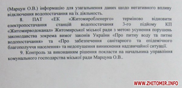Марцун подчеркнул, что действия облэнерго могут привести к чрезвычайной ситуации, связанной с возникновением массовых инфекционных заболеваний, и массовым отравлением людей в результате употребления некачественной питьевой воды. Без гарантированного водоснабжения остались около 36 тысяч житомирян.