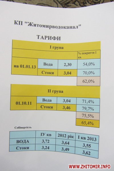 «Сейчас тариф составляет 65% от себестоимости и за прошлый месяц мы рассчитались на 35%, уровень расчетов населения в прошлом месяце около 96%. Для второй группы потребителей (предприятия и организации – ред.) тариф составляет 68% от себестоимости и это, фактически – убытки «Житомирводоканала», т.к. компенсация разницы в тарифах по этой группе правительством не предусмотрена», - сообщил Александр Марцун.