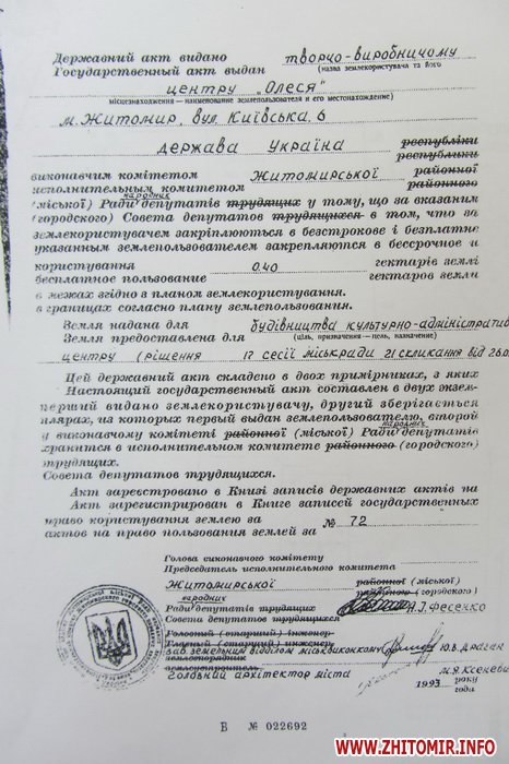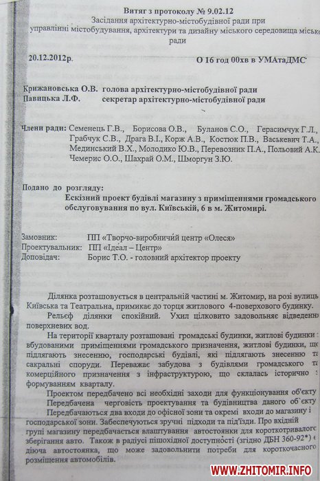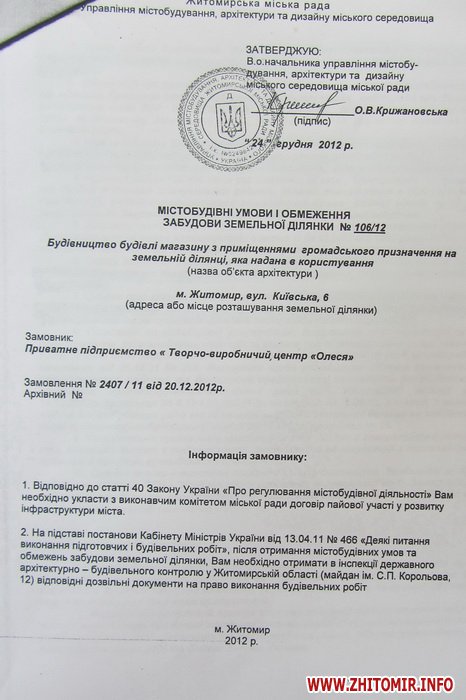 На пресс-конференции 3 июня в Житомире Зубко предоставил документы, которые свидетельствую о том, что власти города самовольно изменили целевое назначение земельного участка: в 1993 году земля выделялась для строительства культурно-административного центра, а в декабре 2012 года власти разрешили построить там «магазин с помещениями общественного назначения».