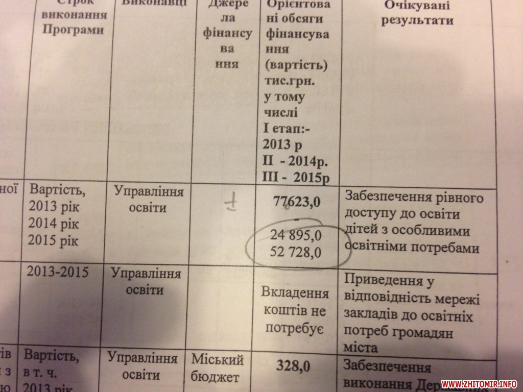 У Програмі розвитку освіти м. Житомира на період 2013-2015 років на цей рік кошти на розвиток інклюзивної освіти не передбачені, на 2014 рік – лише 24 895 грн., на 2015 – 52 728 грн. Всього 77 623 грн. на три роки.