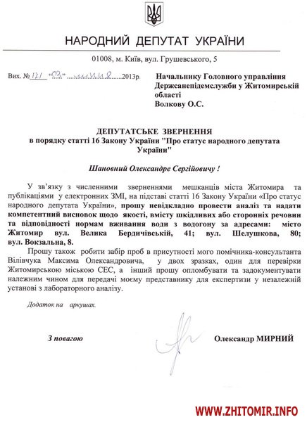 Народний депутат Олександр Мирний (фракція ВО «Свобода») просить начальника головного управління Держсанепідслужби у Житомирській області невідкладно провести аналіз води у водогоні Житомира.