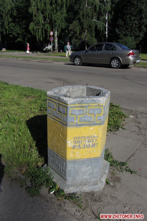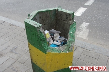 Напомним, что в августе 2010 года за счет бизнесменов в Житомире установили 300 зеленых металлических урн с надписью «Чисте місто» - подарок ко Дню города. В марте 2012 года коммунальщики эти урны демонтировали, т.к. «за два года эксплуатации большинство урн пришли в неудовлетворительное техническое состояние, требуют ремонта, комплектации мусоросборными корзинами и покраски». Через несколько недель некоторые урны вернули на место, но потом власти города решили заменить их новыми.