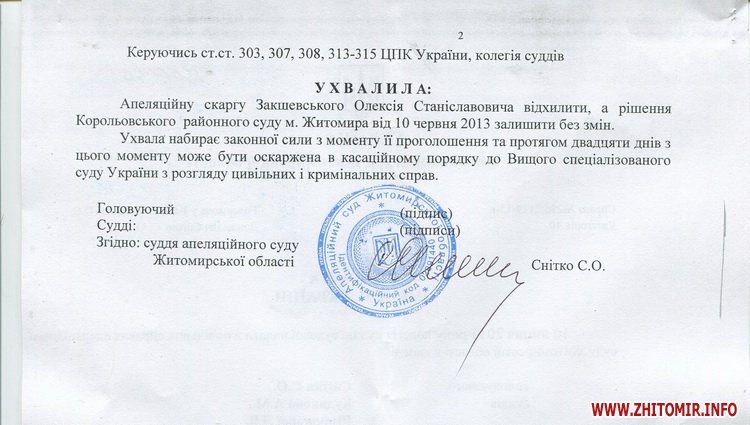 10 июля Апелляционный суд Житомирской области отклонил апелляционную жалобу гражданина Закшевского А.С. и оставил без изменения решение Королевского районного суда Житомира.