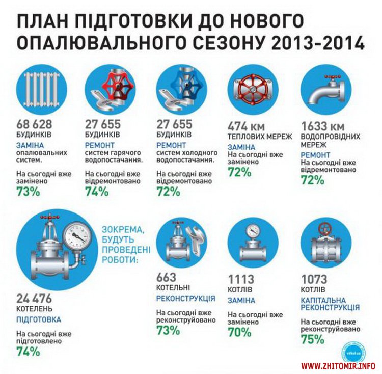 В Україні станом на 13 серпня роботи з підготовки об’єктів ЖКГ та соціальної сфери до опалювального сезону вже виконані на 75%. До 1 вересня мають бути закінчені підготовчі роботи до зими у всіх навчальних закладах країни. До 1 жовтня – на всіх об’єктах.