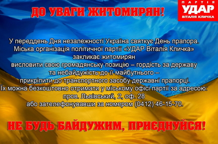У переддень Дня незалежності Україна святкує День прапора. Міська організація політичної партії «УДАР Віталія Кличка» закликає житомирян висловити свою громадянську позицію – гордість за державу та небайдужість до її майбутнього – прикріпити до транспортного засобу державні прапорці.