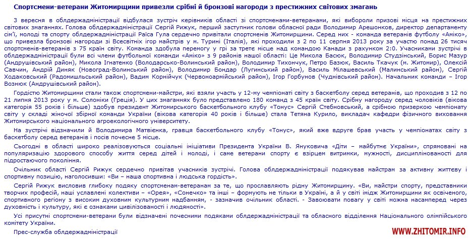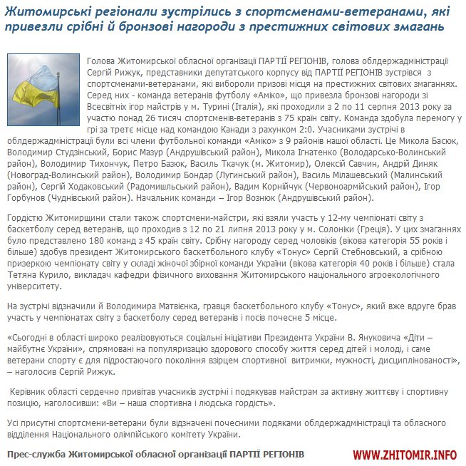 Новости отличаются только началом: на сайте облгосадминистрации – «3 вересня в облдержадміністрації відбулася зустріч керівників області зі спортсменами-ветеранами, які вибороли призові місця на престижних світових змаганнях. Голова облдержадміністрації Сергій Рижук, перший заступник голови обласної ради Володимир Арешонков, директор департаменту сім’ї, молоді та спорту облдержадміністрації Раїса Гула сердечно привітали спортсменів Житомирщини»; на сайте ПР – «Голова Житомирської обласної організації ПАРТІЇ РЕГІОНІВ, голова облдержадміністрації Сергій Рижук, представники депутатського корпусу від ПАРТІЇ РЕГІОНІВ зустрівся з спортсменами-ветеранами, які вибороли призові місця на престижних світових змаганнях».