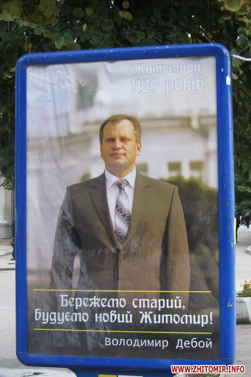 Крім портретів кращих людей на Михайлівській є кілька сіті-лайтів з фотографією мера Володимира Дебоя та слоганом: «Бережемо старий, будуємо новий Житомир!».