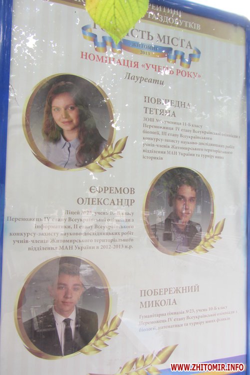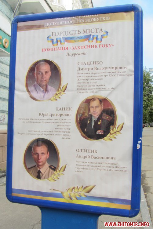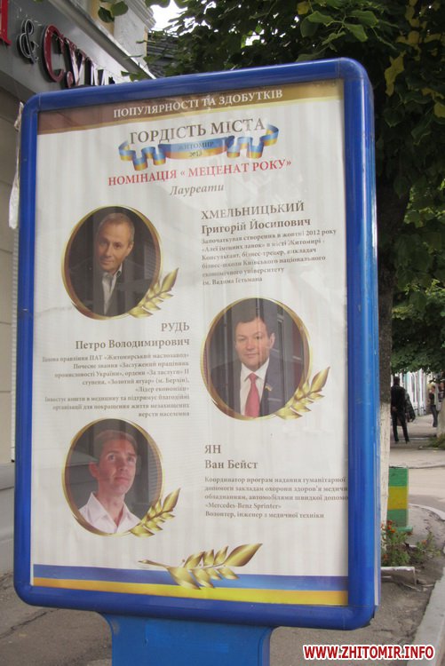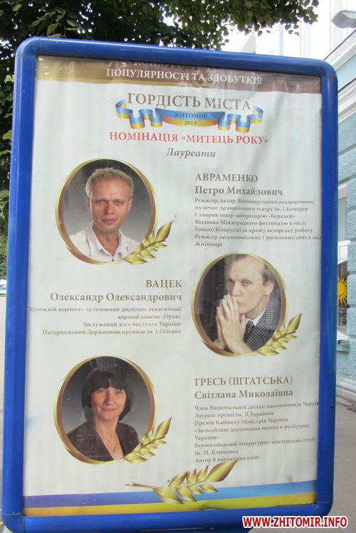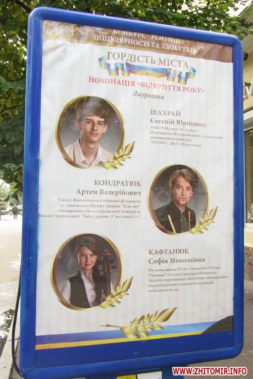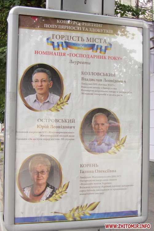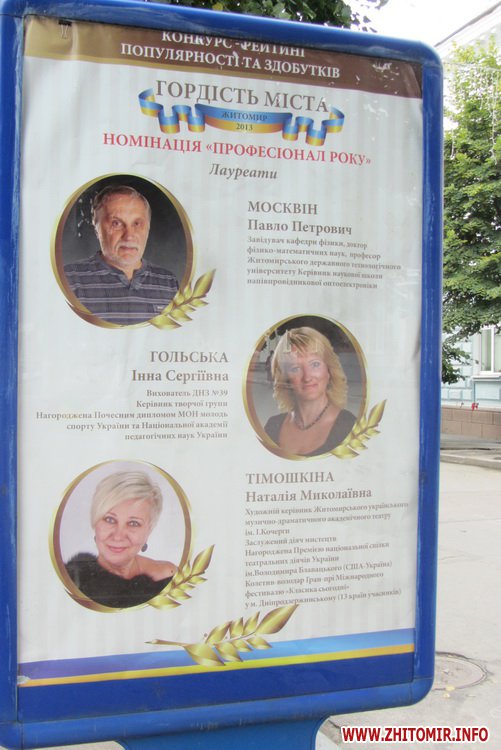 На вулиці Михайлівській з’явилися сіті-лайти з фотографіями лауреатів рейтингу-конкурсу «Гордість міста», який влада Житомира проводить до Дня міста.