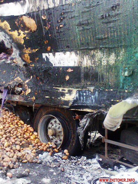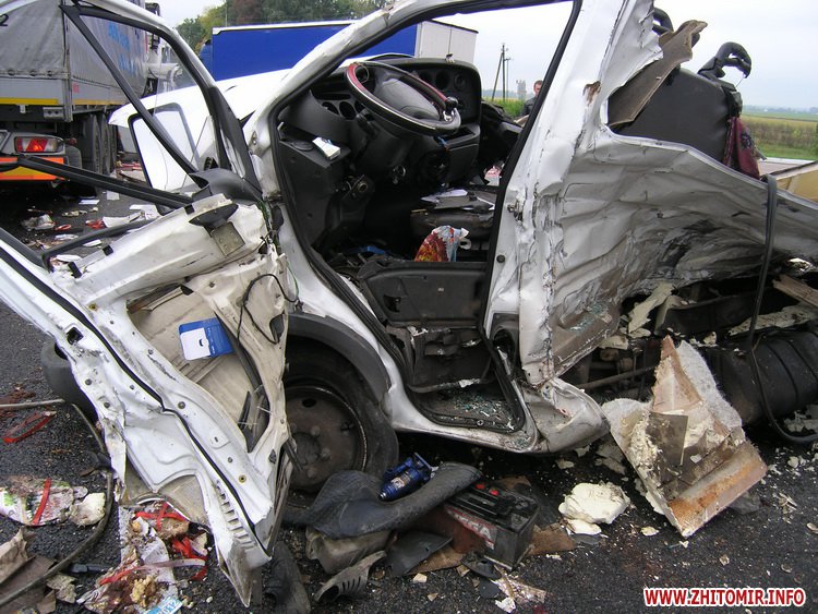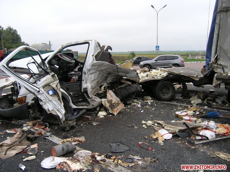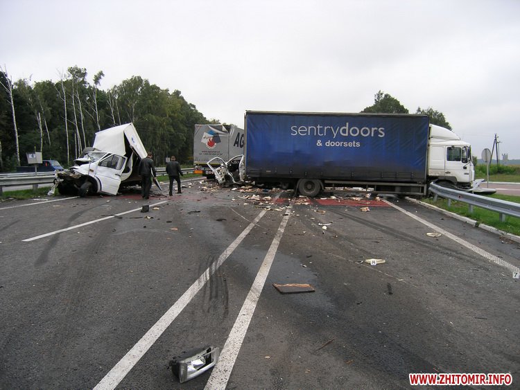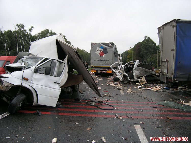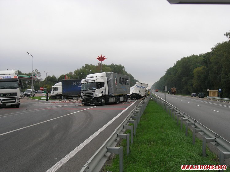 Около 5:30 на 80 км автодороги Киев-Чоп в Радомышльском районе водитель автомобиля Scania, 33-летний житель г. Киева, совершил столкновение с автомобилем МAN под управлением 48-летнего жителя Харькова, который стоял впереди на правой обочине в попутном направлении. После этого автомобиль МAN въехал в автомобиль Iveco, под управлением 44-летнего жителя г. Черновцы, который также стоял впереди на правой обочине в попутном направлении. В дальнейшем Iveco столкнулся с еще одним припаркованным грузовиком - автомобилем Mercedes, под управлением 30-летнего жителя г. Винница.