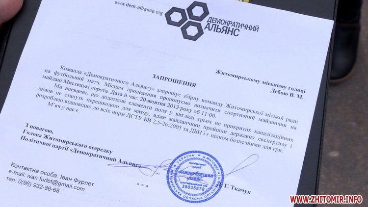 Щоб чиновники Житомира довели, що майданчик цілком безпечний, громадські активісти запросили їх пограти у футбол. Відправили офіційне запрошення і тепер готуються до матчу.