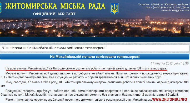 Напомним, что несколько дней назад пресс-служба мэрии распространила сообщение о том, что на углу Михайловской-Лятошинского теплокоммунэнерго начало «работы по полной замене участка (38 п.м.) теплосети».