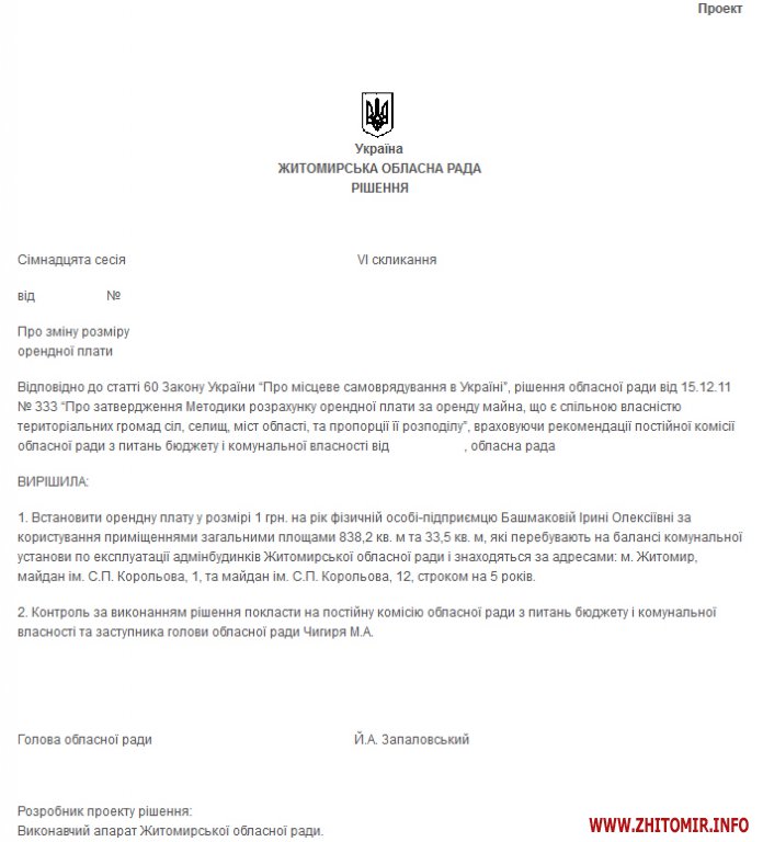 «Областной совет решил установить арендную плату в размере 1 грн. в год физическому лицу – предпринимателю Башмаковой Ирине Алексеевне за пользование помещениями общими площадями 838,2 кв. м и 33,5 кв. м, которые находятся на балансе коммунального учреждения по эксплуатации админзданий Житомирского областного совета и расположены по адресам: г. Житомир, площадь им. С.П. Королева, 1 и площадь им. С.П. Королева, 12, сроком на 5 лет», - говорится в проекте решения.