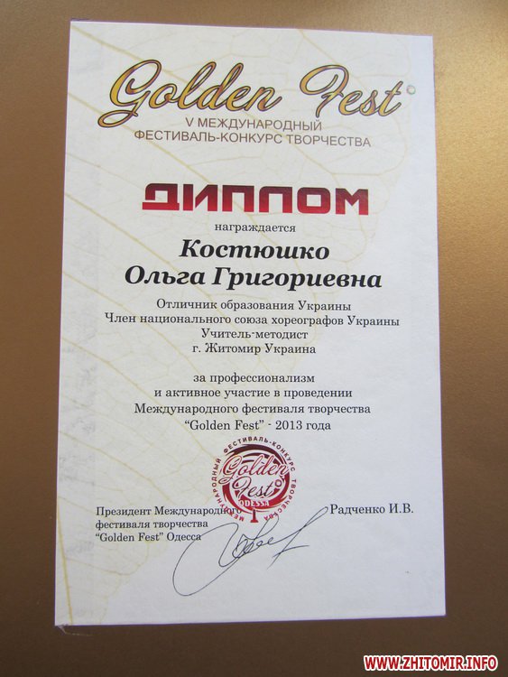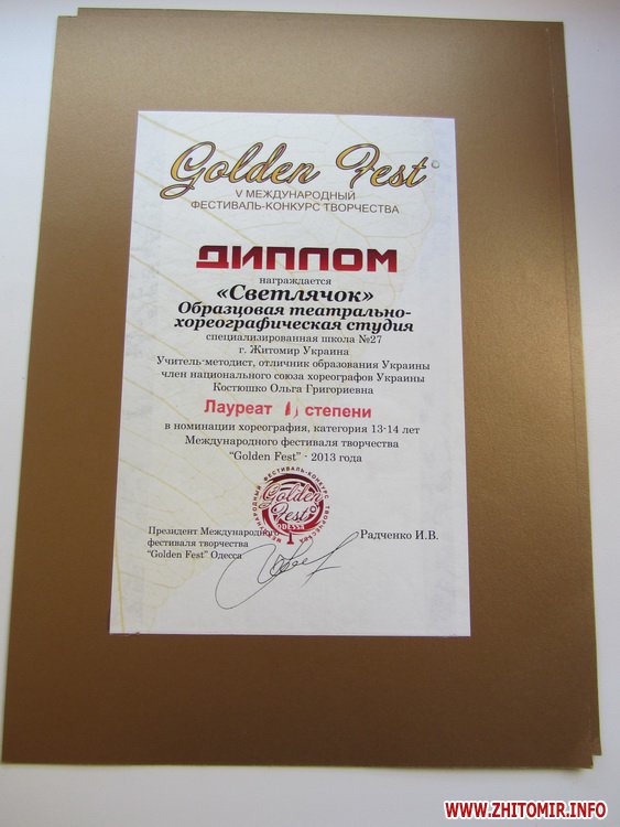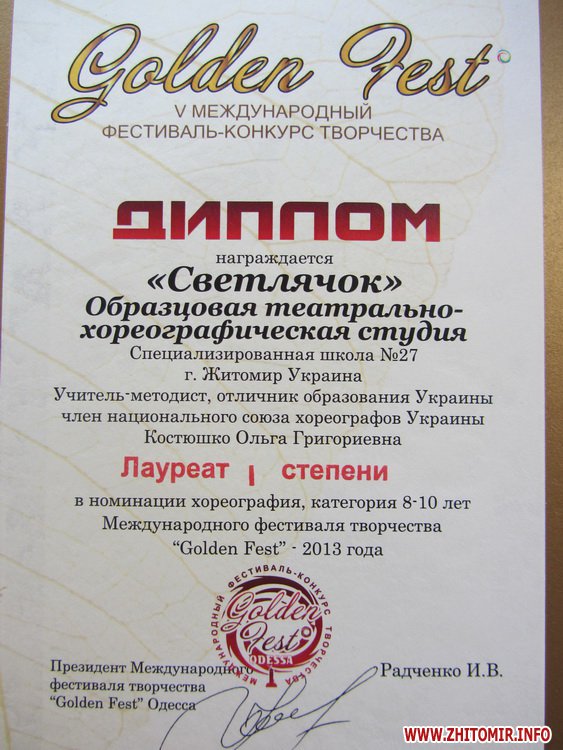 Зразкова театрально-хореграфічна студія «Світлячок» житомирської загальноосвітньої школи № 27 здобула чергову перемогу на п`ятому міжнародному конкурсі-фестивалі творчості «Golden Fest» в місті Одеса, який відбувся 26-29 жовтня.