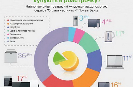 Таку інфографіку підготував ПриватБанк, проаналізувавши дані за обсягом покупок за допомогою сервісу миттєвої розстрочки «Оплата частинами» в торгових точках України. За даними банкірів, з початку року більше 17% оформлених розстрочок припадає на придбання комп'ютерної техніки.