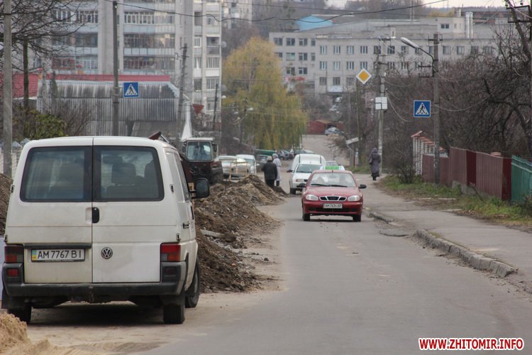 Транспорт объезжает место «раскопок» по тротуару, а любопытные житомиряне могут увидеть, как выглядит дорога в разрезе.