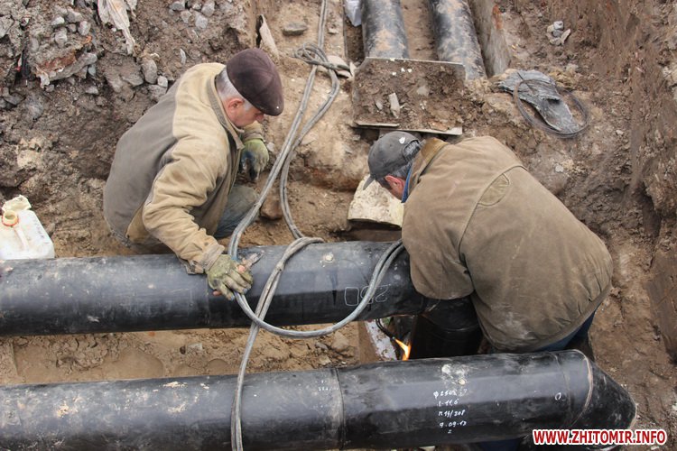 Работники КП «Житомиртеплокоммунэнерго» меняют старые трубы на новые.