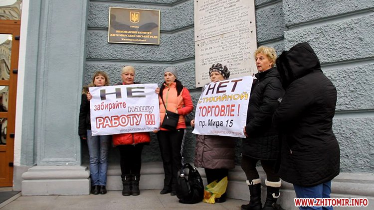 Вони залишили роботу і пішли під Житомирську міську раду, вимагати у депутатів припинити вуличну торгівлю на проспекті Миру. Продавці ринку «Хмільники» скаржаться: втрачають покупців, бо на зупинці поряд з їхнім базаром конкуренти продають овочі та фрукти за нижчими цінами.