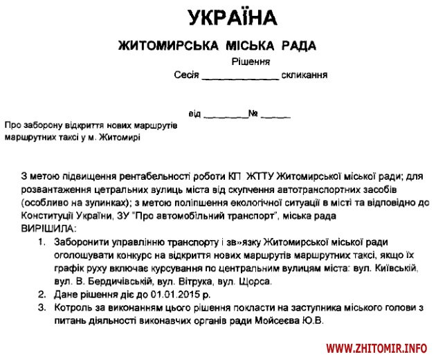 «З метою підвищення рентабельності КП ЖТТУ Житомирської міської ради; для розвантаження центральних вулиць міста від скупчення автотранспортних засобів (особливо на зупинках); з метою поліпшення екологічної ситуації в місті міська рада вирішила заборонити управлінню транспорту і зв’язку Житомирської міської ради оголошувати конкурс на відкриття нових маршрутів маршрутних таксі, якщо їх графік руху включає курсування по центральних вулицях міста: вул. Київській, вул. В. Бердичівській, вул. Вітрука, вул. Щорса», - йдеться у проекті рішення.