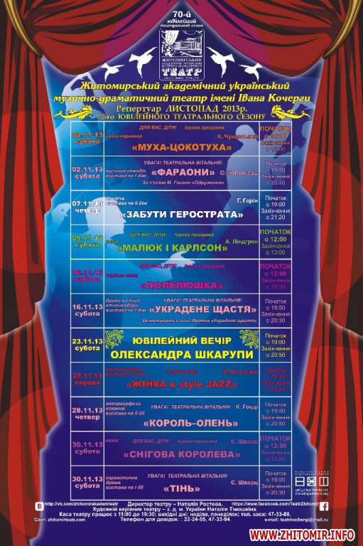На 19.00 в Житомирському академічному українському музично-драматичному театрі ім..Івана Кочерги запланований ювілейний вечір Олександра Шкарупи. Шкарупа відомий житомирянам як актор та гуморист, учасник місцевого жарт-клубу «Побрехеньки». Зараз Олександр Миколайович – директор-розпорядник житомирського театру.