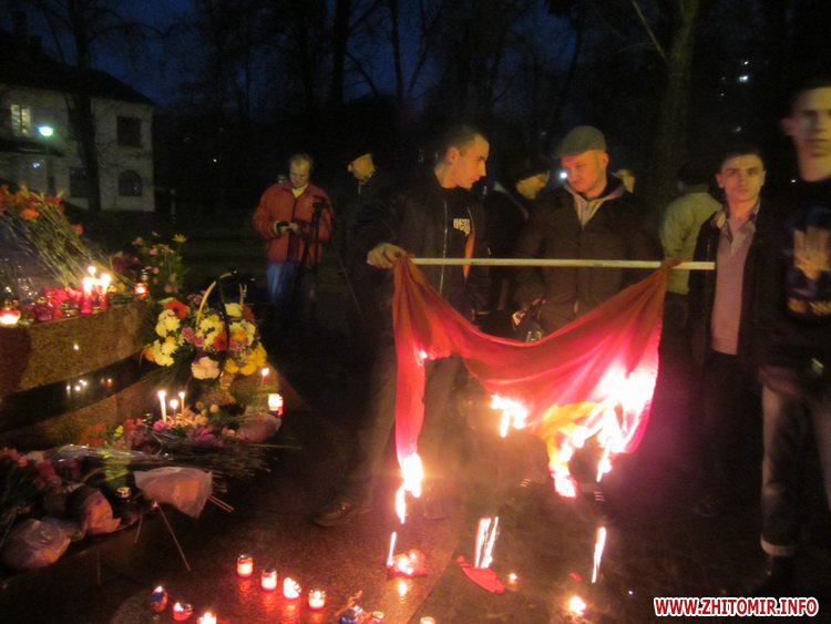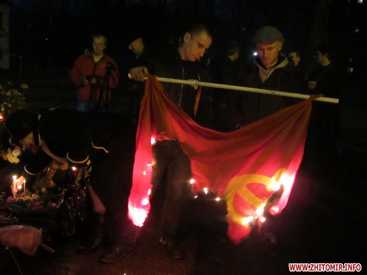 Наприкінці заходу кілька молодих людей спалили біля пам’ятника Сумуючому Янголу прапор Радянського Союзу.