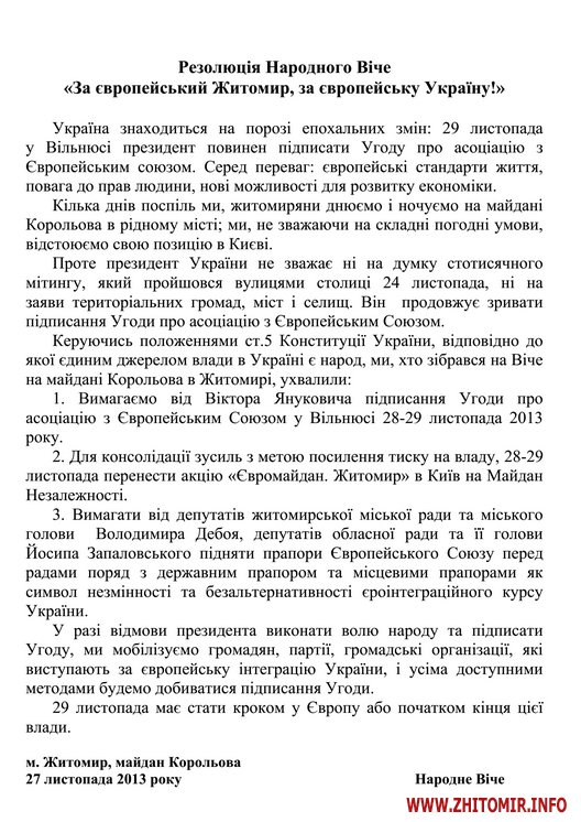 Після півторагодинного мітингу його учасники прийняли резолюцію, в якій вимагають від Віктора Януковича підписати Угоду про асоціацію з Європейським Союзом у Вільнюсі 28-29 листопада 2013 року. У ці дні для консолідації зусиль з метою посилення тиску на владу акція «Євромайдан. Житомир» переноситься в Київ на Майдан Незалежності.