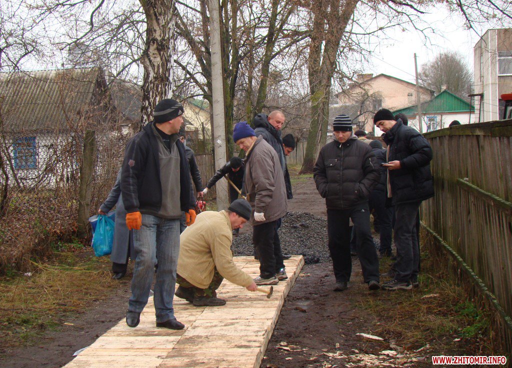 Издание сообщает, что пиломатериалами участников акции обеспечил мэр города, щебень предоставил начальник филиала ГП «Олевский райавтодор», а гвозди и другие расходные материалы принесли неравнодушные родители.