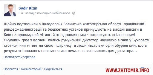 «Щойно подзвонили з Володарськ-Волинська Житомирської області – працівників райдержадміністрації та бюджетних установ примушують на вихідні виїхати в Київ на провладний мітинг. Хто відмовляється – погрожують звільненням», - написав зранку у фейсбук лідер житомирської організації ВО «Свобода» Сидір Кізін.