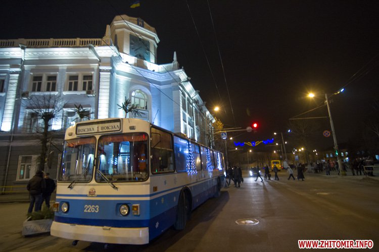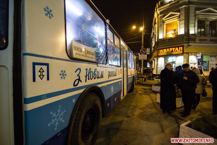 Житомирян поздравил мэр города Владимир Дебой. Он презентовал троллейбус, который своими силами собрали работники ТТУ. Дебой также сказал, что этот троллейбус будет в новогоднюю ночь и на Рождество возить людей бесплатно по маршруту №1.