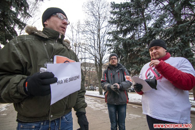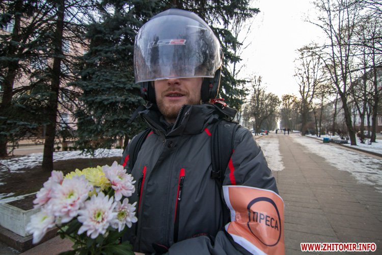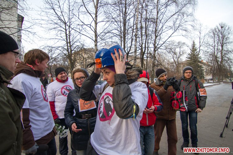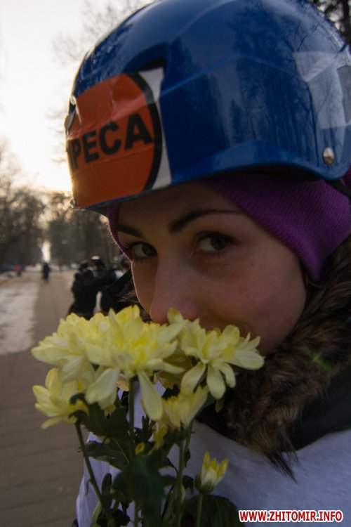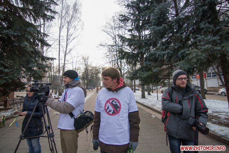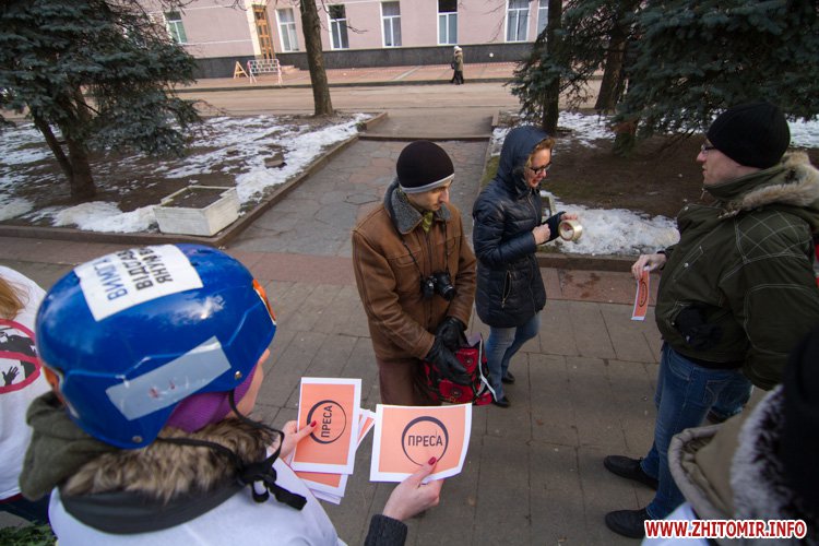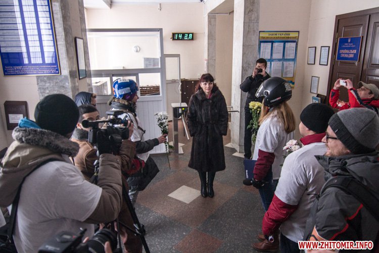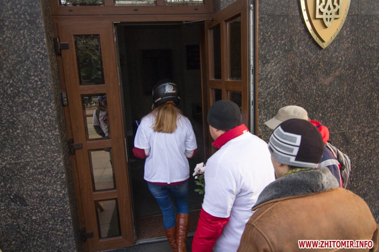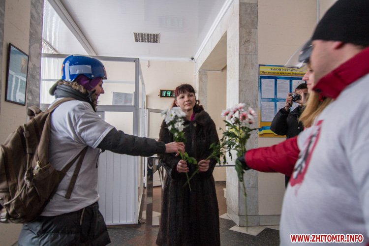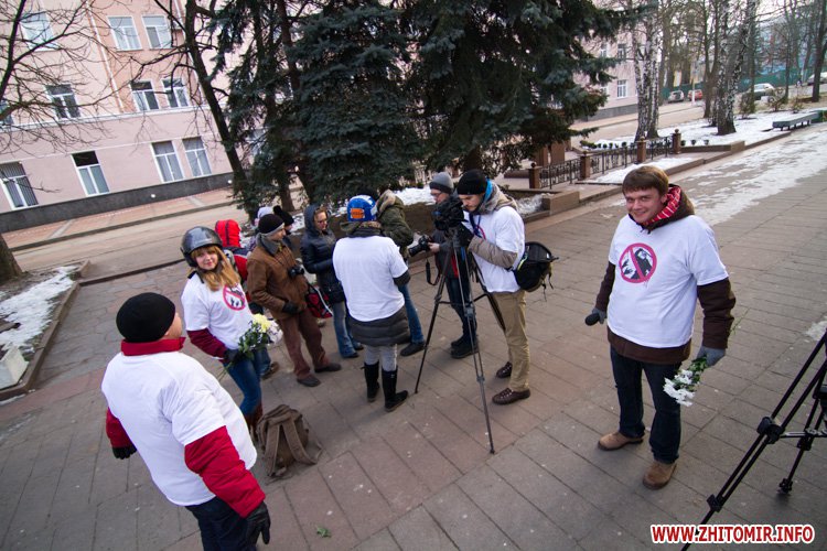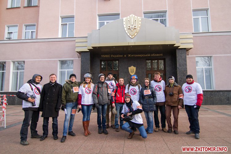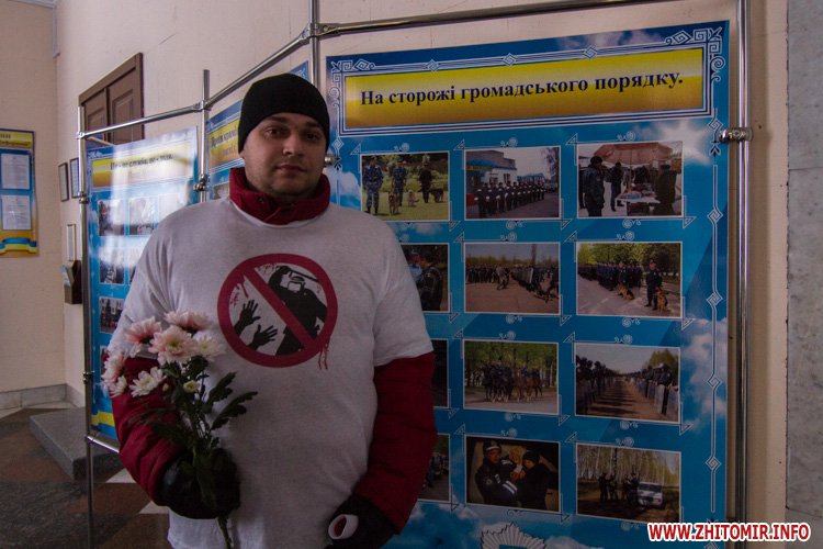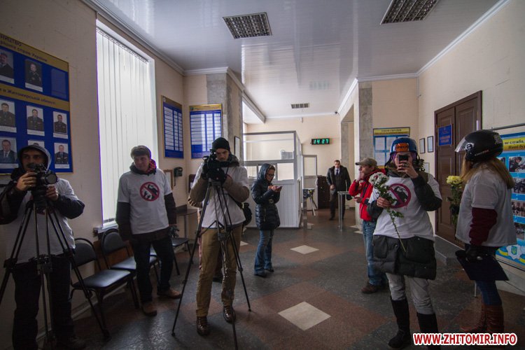 13 журналістів з квітами прийшли до приміщення на Старому бульварі: одні були одягнені у футболки зі знаком «Не бий», інші – з наклейками «Преса». Букет передали начальнику сектору зв’язків з громадськістю УМВС в Житомирській області Аллі Ващенко та побажали міліціонерам бути професійними, дотримуватись стандартів і не виконувати злочинних наказів.