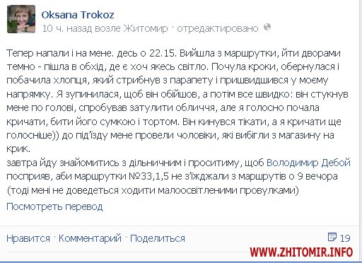 Вечером 29 декабря в Житомире, недалеко от перекрестка улиц Космонавтов и Селецкая, неизвестный напал на журналистку Житомир.info и «5 канал» Оксану Трокоз.