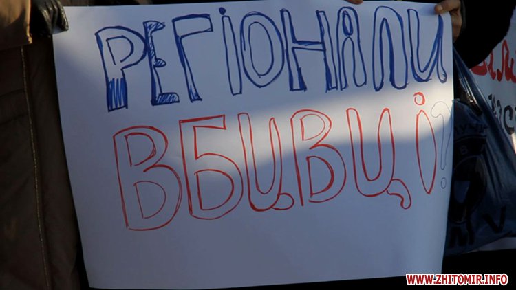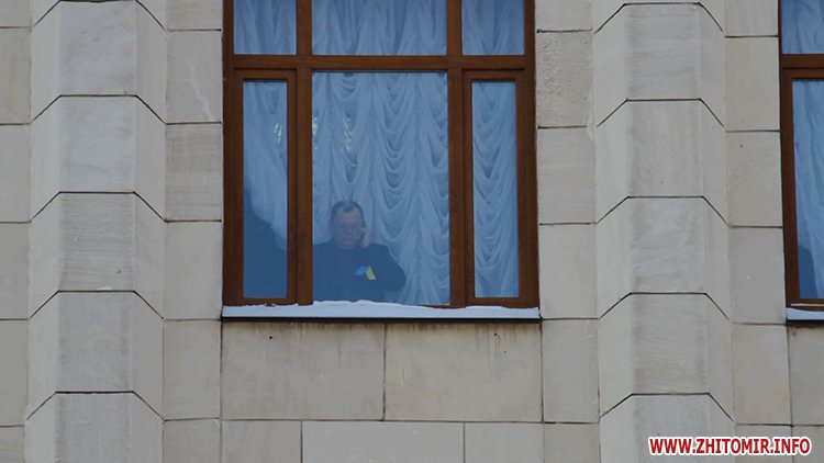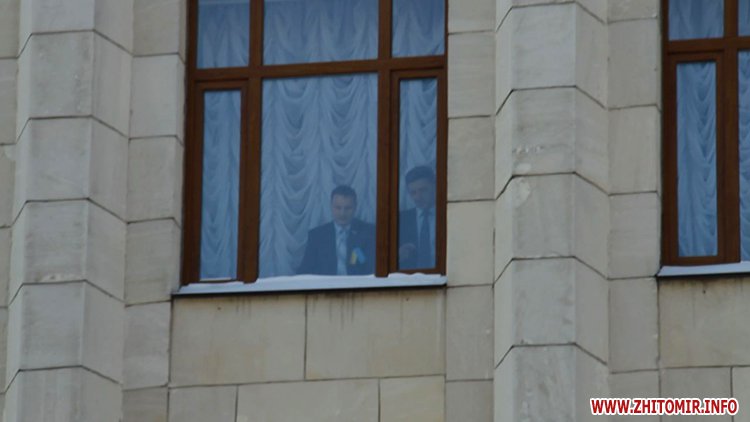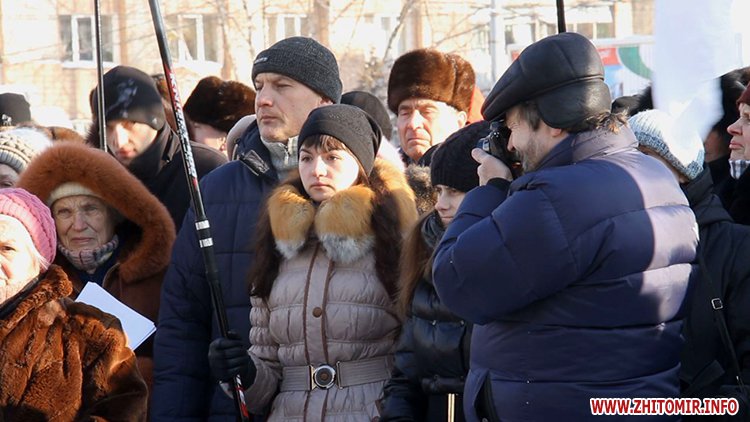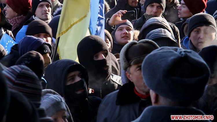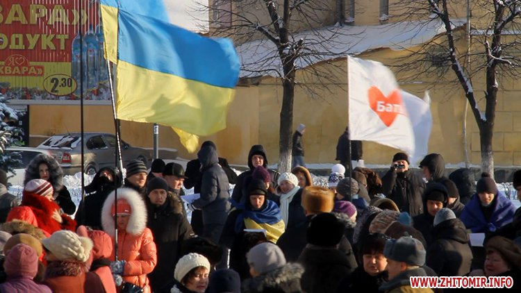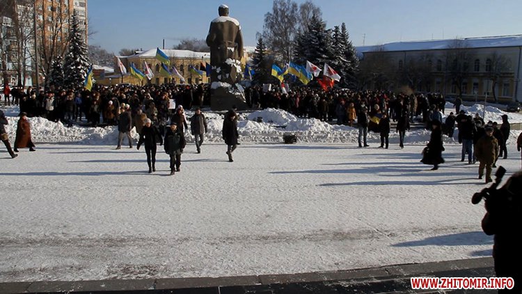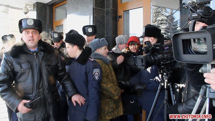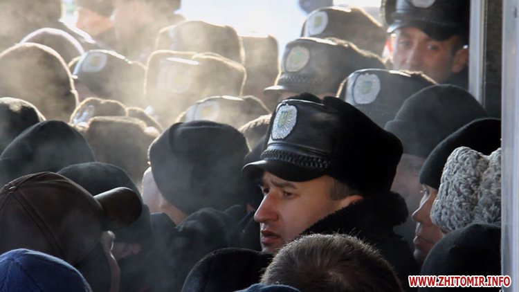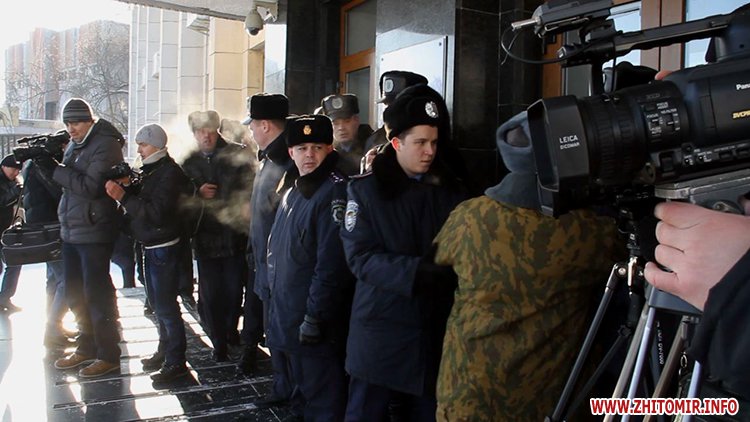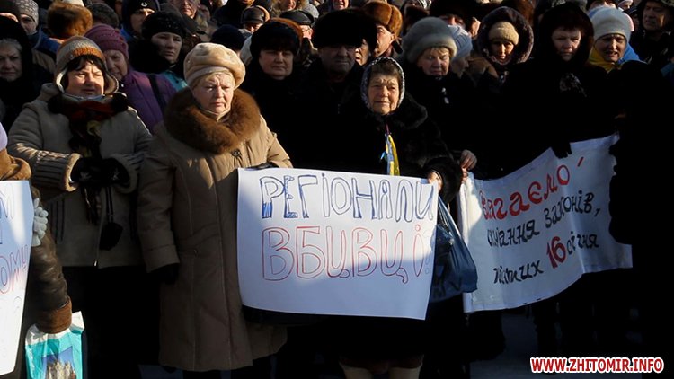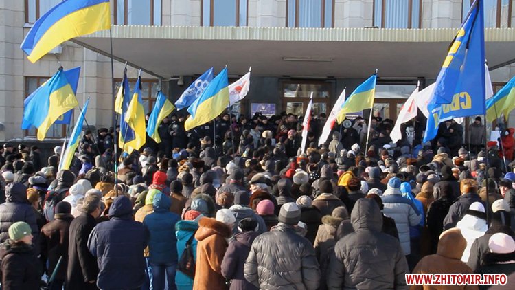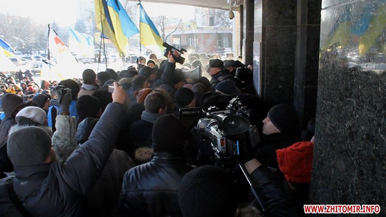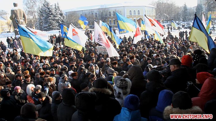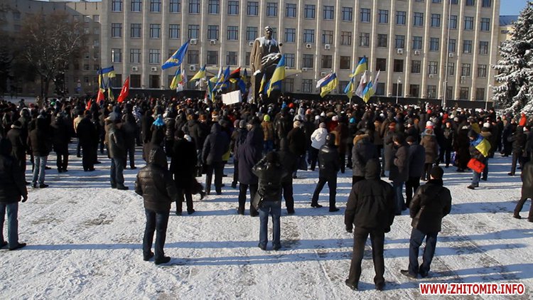 Близько п’яти сотень людей зібрались під стінами Житомирської облдержадімінстрації, де 23 січня розпочала роботу сесія облради. Люди прийшли мирно висловити свій протест. Вони вимагали від депутатів ухвалити звернення про скасування законів, прийнятих у Верховній Раді 16 січня, та відставку уряду і президента.