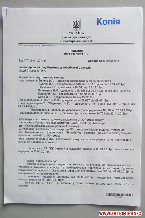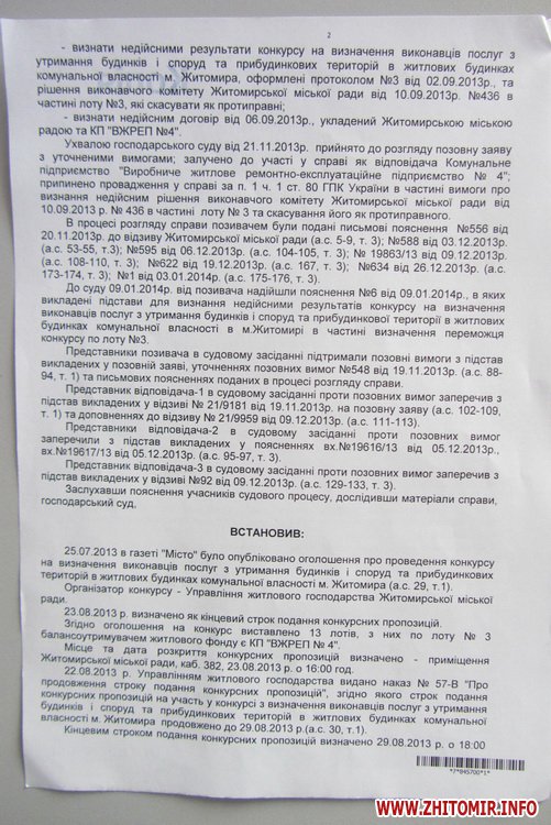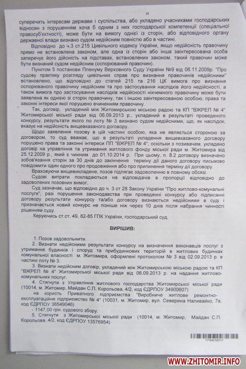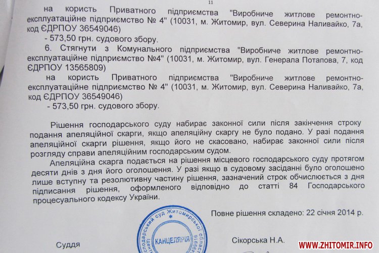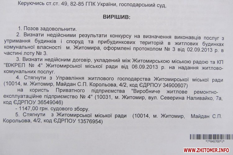 Господарський суд Житомирської області задовольнив позов приватного підприємства «ВЖРЕП №4» до Житомирської міської ради, управління житлового господарства та КП «Виробниче житлове ремонтно-експлуатаційне підприємство №4».