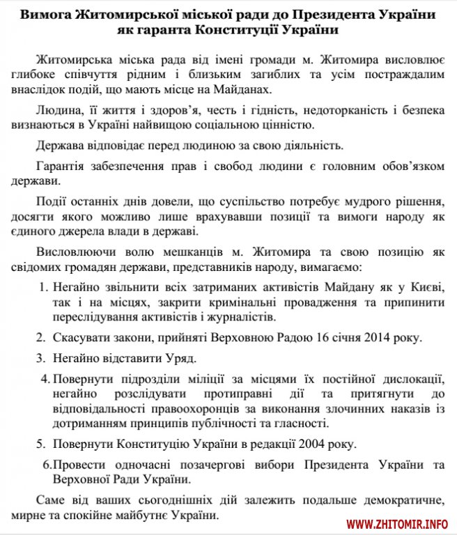 Нагадаємо, що на позачерговій сесії Житомирської міської ради 24 січня депутати проголосували за шість вимог до президента.