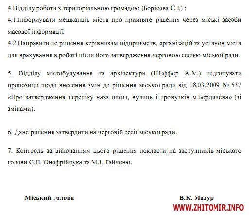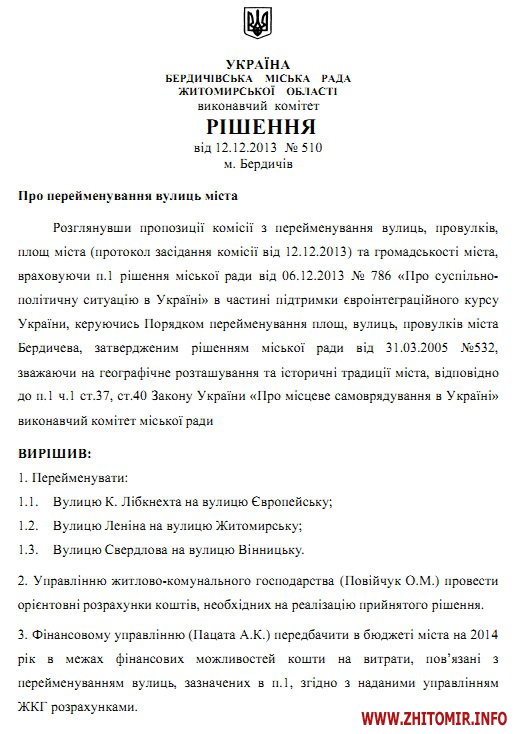 Доводимо до Вашого відома рішення виконавчого комітету від 12.12.2013 №510 «Про перейменування вулиць міста», яке будо затверджено рішенням Бердичівської міської ради від 24.01.2014 №795 і набрало чинності», - таке повідомлення опубліковане на офіційному сайті Бердичівської мерії.