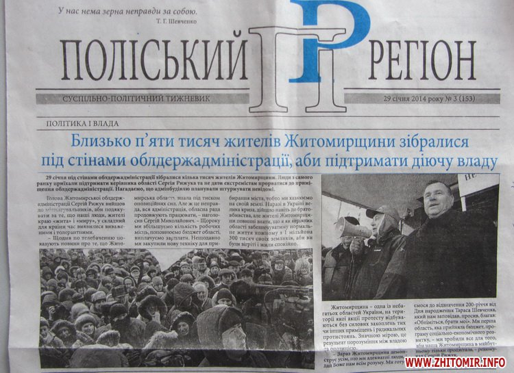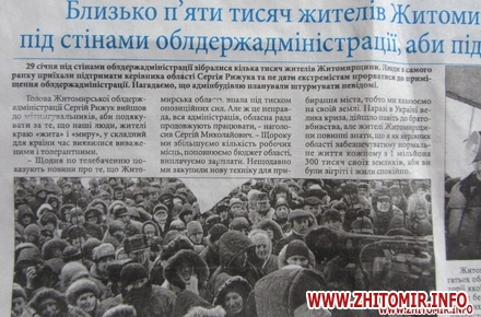 Статья на первой странице номера от 29 января называется «Близько пяти тисяч жителів Житомирщини зібралися під стінами облдержадміністрації, аби підтримати діючу владу».