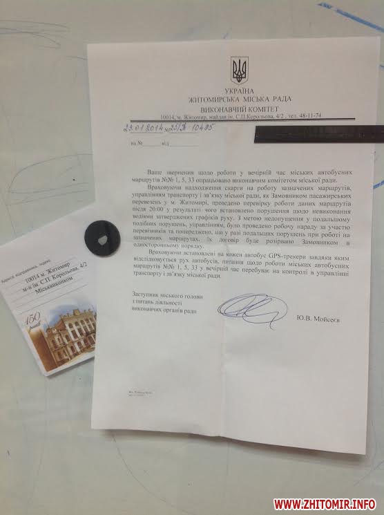«Враховуючи надходження скарги на роботу зазначених маршрутів, управлінням транспорту і зв’язку міської ради як Замовником пасажирських перевезень у м. Житомирі проведено перевірку роботи даних маршрутів після 20.00, у результаті чого встановлено порушення щодо невиконання водіями затверджених графіків руху. З метою недопущення у подальшому подібних порушень Управлінням було проведено робочу нараду за участю перевізників та попереджено, що у разі подальших порушень при роботі на зазначених маршрутах, їх договір буде розірвано Замовником в односторонньому порядку», - йдеться у листі-відповіді.