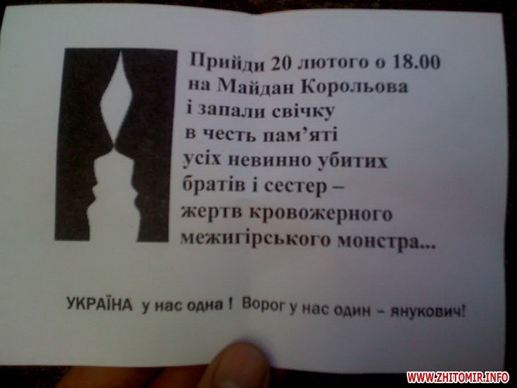«Прийди 20 лютого о 18.00 на майдан Корольова і запали свічку в честь пам’яті усіх невинно убитих братів і сестер – жертв кровожерного межигірського монстра…», - йдеться у запрошенні.