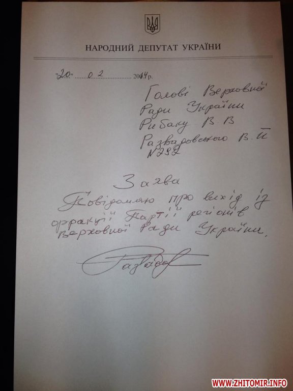 Как сообщал Житомир.info, народный депутат из Житомирской области Юрий Благодыр написал заявление о выходе из фракции Партии регионов.