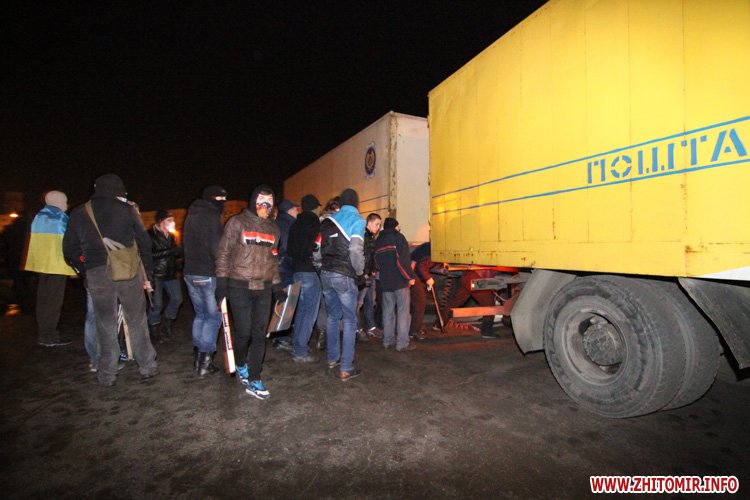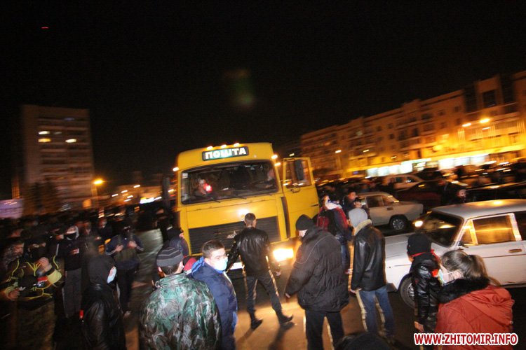 После 22.00 около сотни активистов «Правого сектора» второй раз за день пришли к памятнику Ленина. Сначала, как и днем, бросали в гранитного Ильича «коктейли молотова». Потом начали останавливать проезжающие по площади машины и просить у водителей тросы.