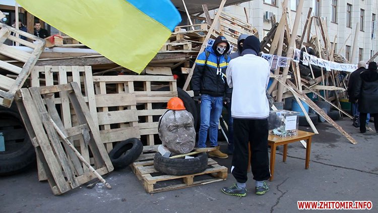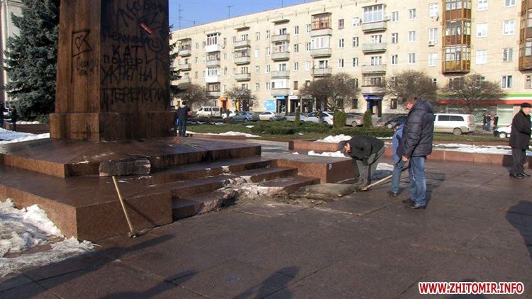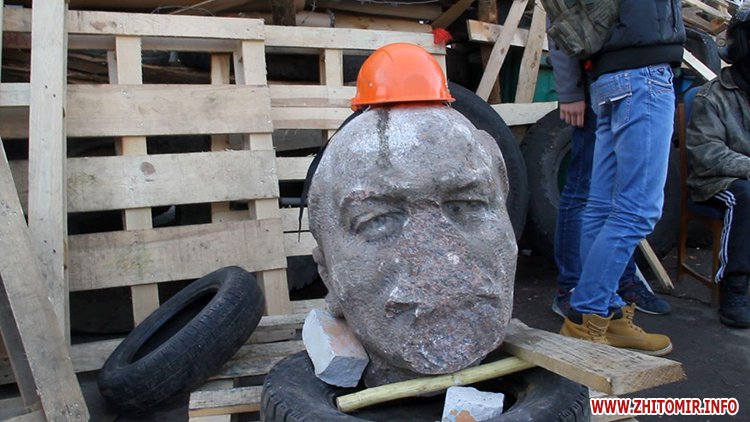 Частину пам’ятника ще вночі розібрали на сувеніри, голову поставили біля барикад на майдані Корольова, куди подівся гранітний тулуб, не знають навіть місцеві комуністи.