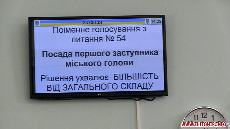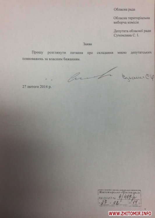 27 февраля Сергей Сухомлин стал первым заместителем мэра Житомира. Галина Семенец ушла с этой должности после отставки мэра Владимира Дебоя: она написала заявление «по согласию сторон» и за это проголосовали 39 депутатов.